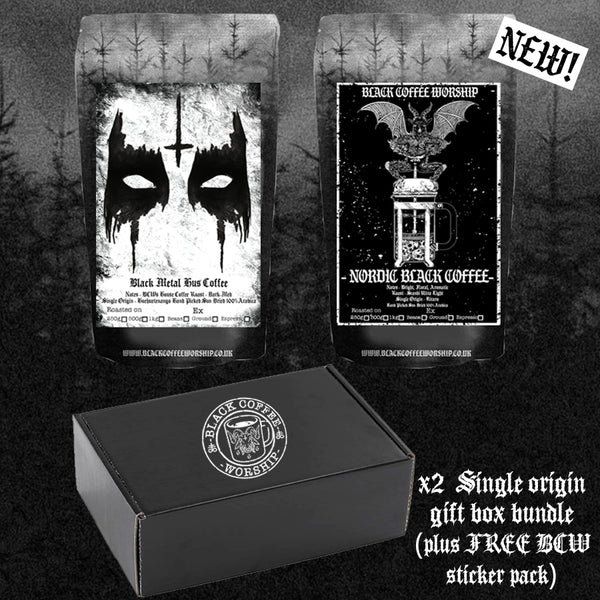 x2 250g single origin high grade coffees in our brand new 100% recyclable printed eco bags sat nicely in our black gift box offering bundles